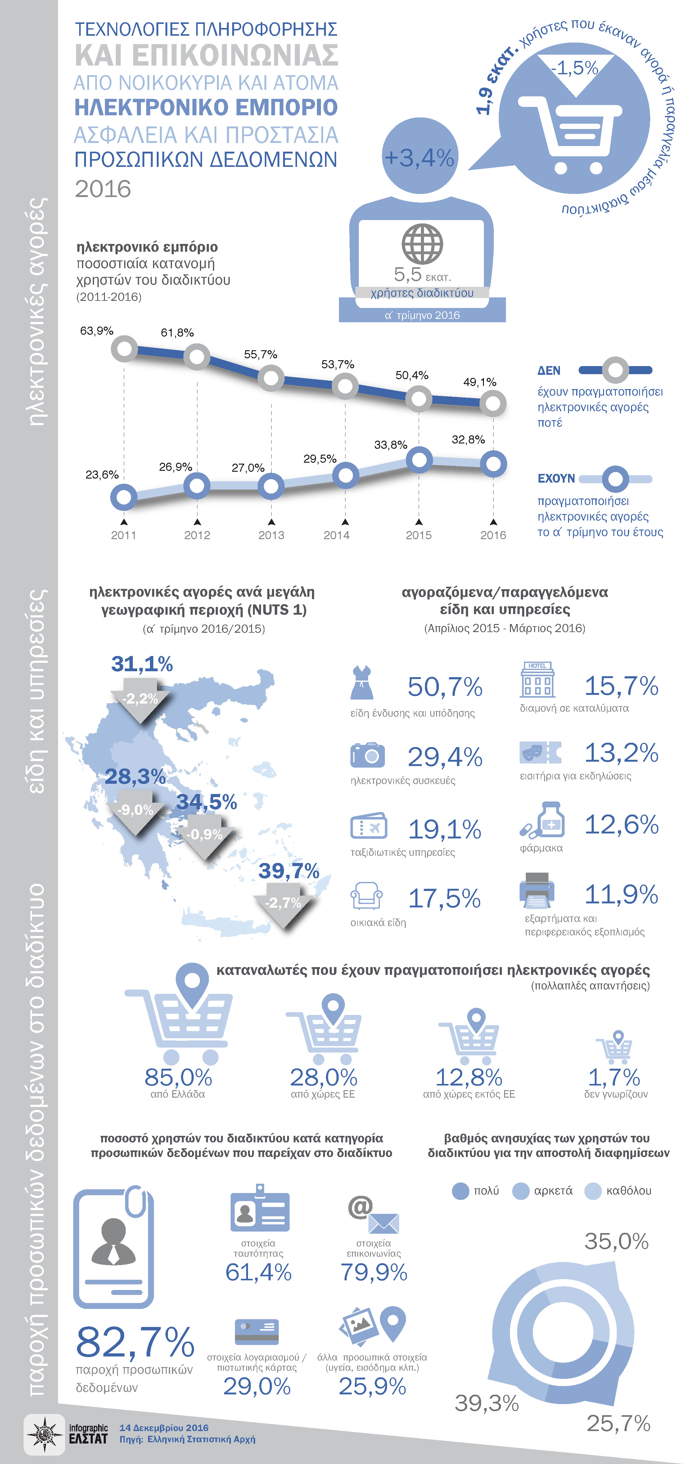 Η Ελληνική Στατιστική Αρχή ανακοινώνει στοιχεία για τον βαθμό χρήσης των νέων τεχνολογιών από τα νοικοκυριά και τα μέλη τους, ειδικότερα δε για το ηλεκτρονικό εμπόριο και την ασφάλεια και προστασία των προσωπικών δεδομένων των χρηστών. Τα στοιχεία προέρχονται από τη δειγματοληπτική Έρευνα Χρήσης Τεχνολογιών Πληροφόρησης και Επικοινωνίας από Νοικοκυριά και Άτομα, έτους 2016.
