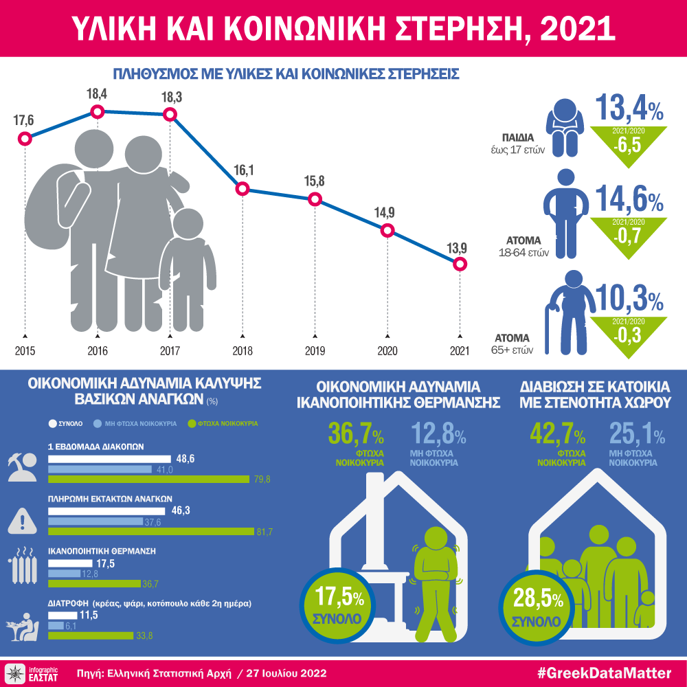 Η Ελληνική Στατιστική Αρχή (ΕΛΣΤΑΤ) ανακοινώνει στοιχεία για την Υλική και Κοινωνική Στέρηση και τις Συνθήκες Διαβίωσης, έτους 2021.
