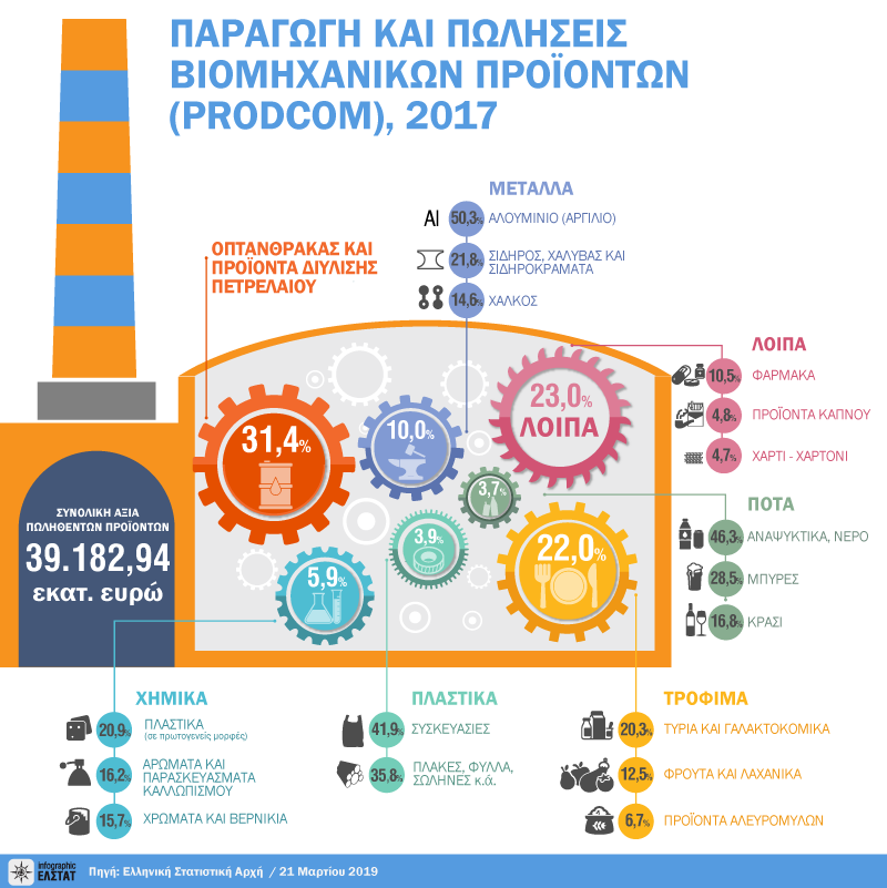 Η Ελληνική Στατιστική Αρχή (ΕΛΣΤΑΤ) ανακοινώνει τα αποτελέσματα της έρευνας Παραγωγή και Πωλήσεις Βιομηχανικών Προϊόντων (PRODCOM) για το έτος 2017.