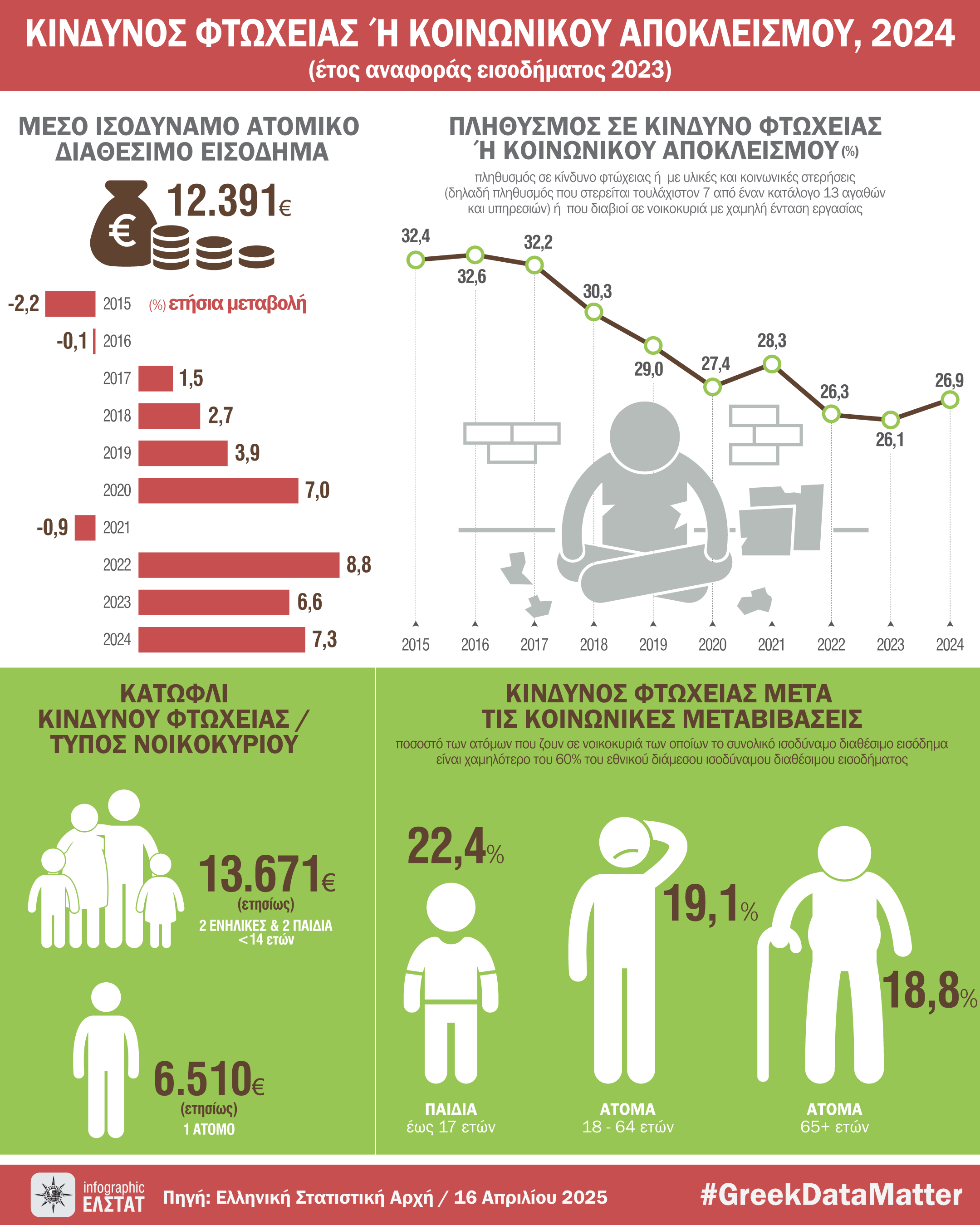 Η Ελληνική Στατιστική Αρχή (ΕΛΣΤΑΤ) ανακοινώνει στοιχεία για τον Πληθυσμό σε Κίνδυνο Φτώχειας ή Κοινωνικό Αποκλεισμό έτους 2024.
