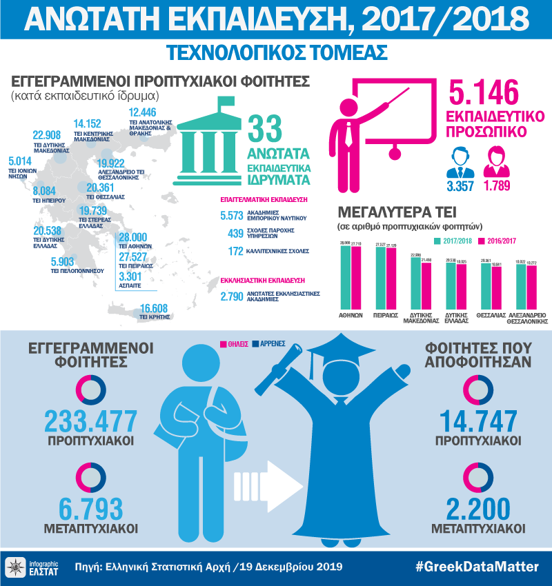 Η Ελληνική Στατιστική Αρχή (ΕΛΣΤΑΤ) ανακοινώνει τα αποτελέσματα που αφορούν στις στατιστικές Ανώτατης Εκπαίδευσης(Τεχνολογικός Τομέας), λήξης ακαδημαϊκού έτους 2017/2018.