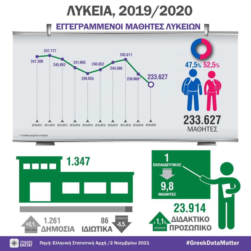 ΕΛΣΤΑΤ, Γενικά Λύκεια (σχ. πληθυσμός,μονάδες,προσωπικό) (Έναρξη-Λήξη). Ημερομηνία δημοσίευσης: 2.11.2021