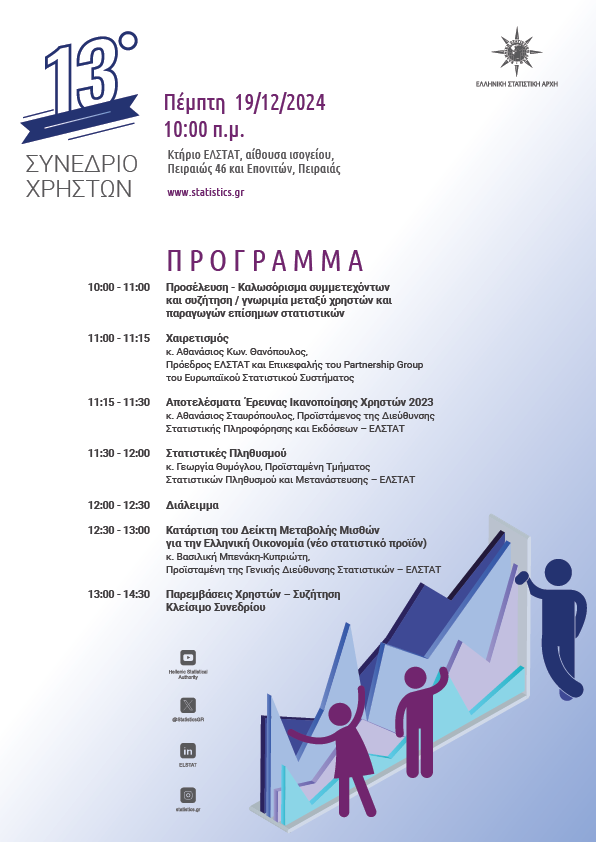 Η Ελληνική Στατιστική Αρχή, με συνέπεια και σεβασμό στους χρήστες των στατιστικών της, πραγματοποιεί το 13ο Ετήσιο Συνέδριο Χρηστών Στατιστικών Στοιχείων.