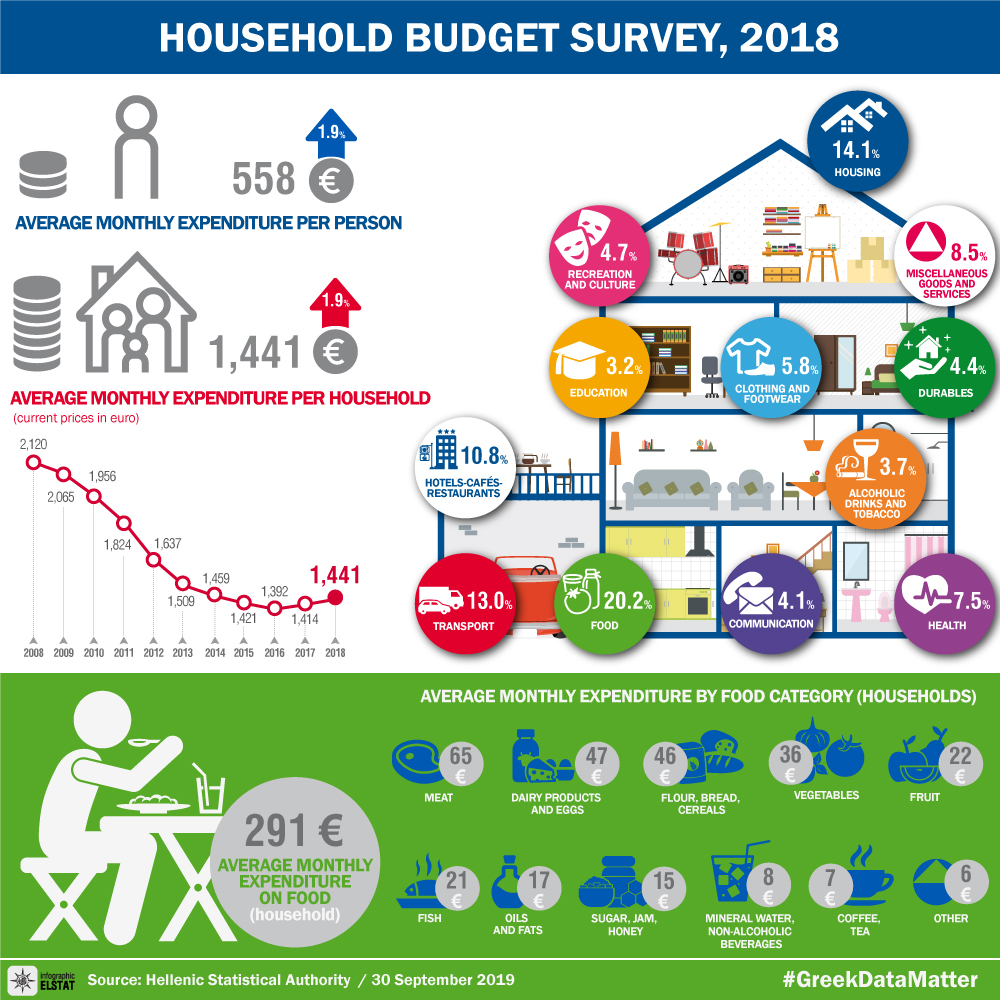 The Hellenic Statistical Authority (ELSTAT) announces the results of the Household Budget Survey (HBS) conducted in 2018 (the reference periods of expenditure data are mentioned in detail in the explanatory note, at the end of the press release). The survey was conducted on a sample of private households throughout the Country.