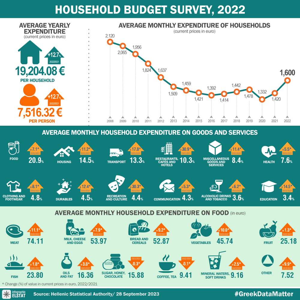 The Hellenic Statistical Authority (ELSTAT) announces the results of the Household Budget Survey (HBS) conducted in 2022 (the reference periods of expenditure data are mentioned in detail in the explanatory note, at the end of the press release). The survey was conducted on a sample of private households throughout the Country.