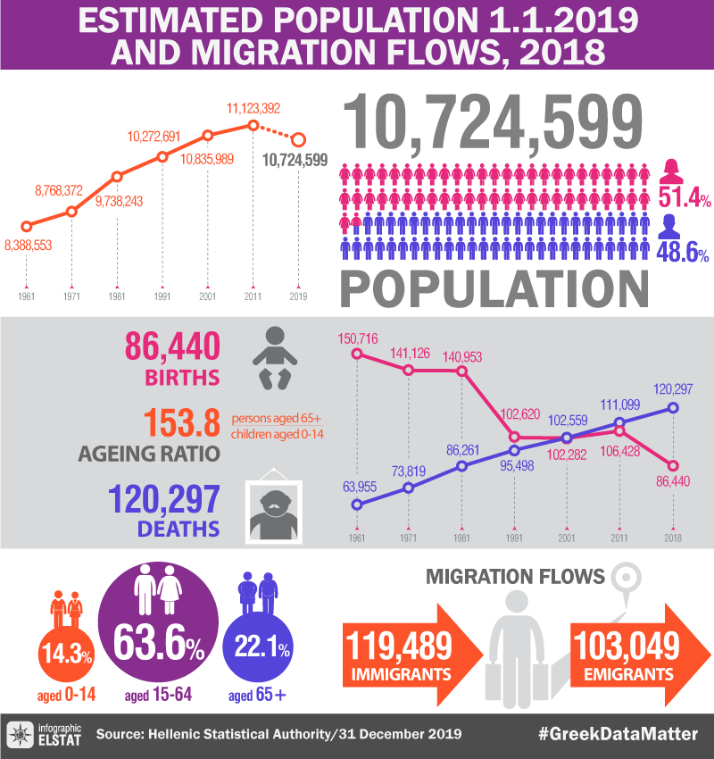 The Hellenic Statistical Authority (ELSTAT) announces data on the usual resident populatiOn of Greece on the 1st January 2019 and the estimates of migration flows for 2018.