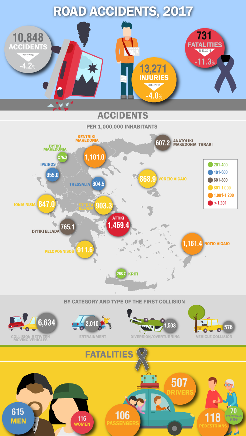 The Hellenic Statistical Authority (ELSTAT) announces the results on injury-causing “Road Accidents” for the year 2017, as well as data on their evolution for the ten-year period 2008-2017.