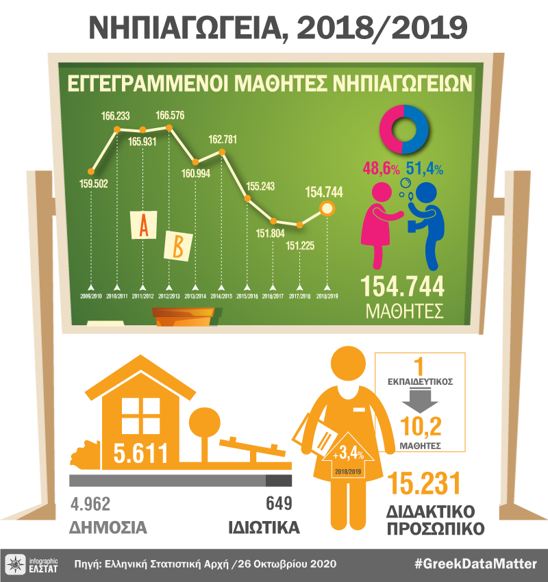 Η Ελληνική Στατιστική Αρχή (ΕΛΣΤΑΤ) ανακοινώνει τα αποτελέσματα της έρευνας Πρωτοβάθμιας Εκπαίδευσης (Νηπιαγωγεία) του έτους 2018.