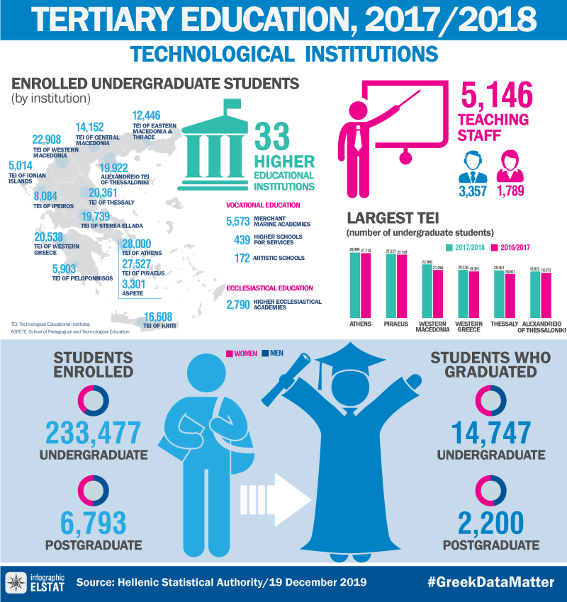 The Hellenic Statistical Authority (ELSTAT) announces data on on Tertiary Education, Technological Institutions, for the end of academic year 2017/2018.